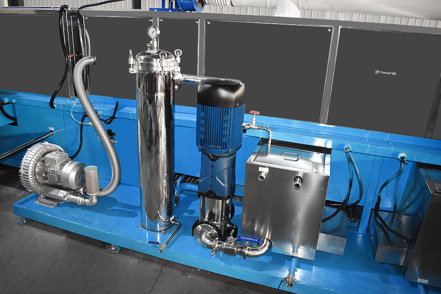 該設備有上下料網帶、超聲波清洗工位、噴淋漂洗工位、高壓風切、熱風烘干工位、溫控水加熱系統、風機、溫控空氣加熱系統、移動式風刀、PLC+觸摸屏控制系統、管路系統及智能電器控制系統等組成。自動進排液和自動加溫系統完全實現了無人干預,自動運行,很大程度上降低了工人的勞動強度。先進的霧氣處理系統可以將清洗時產生的霧氣冷凝回流,空氣經過濾和活性炭吸附后排出。