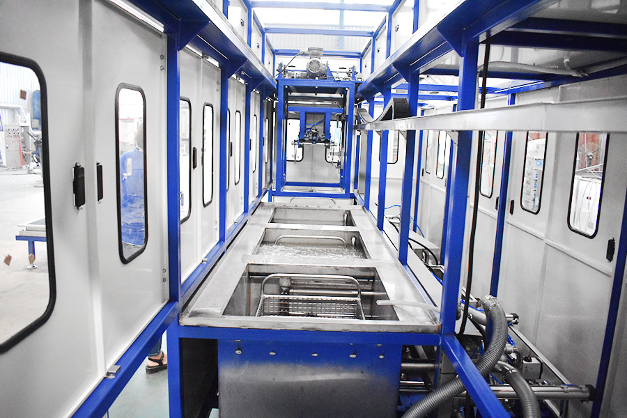 該設(shè)備有自動上下料及轉(zhuǎn)角系統(tǒng)、超聲波清洗系統(tǒng),自動拋動、自動溢流和油污分離裝置,噴淋系統(tǒng)、自動高壓切水系統(tǒng)、自動烘干系統(tǒng)。機械手自動輸送系統(tǒng)采用高精度直線導(dǎo)軌配合高精度位置檢測傳感器,機械手可以準(zhǔn)確的實現(xiàn)工件的抓取和放置。自動進排液和自動加溫系統(tǒng)完全實現(xiàn)了無人干預(yù),自動運行,很大程度上降低了工人的勞動強度。先進的霧氣處理系統(tǒng)可以將清洗時產(chǎn)生的霧氣冷凝回流,空氣經(jīng)過濾和活性炭吸附后排出。