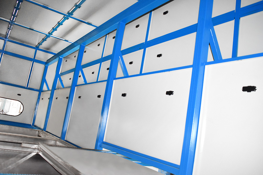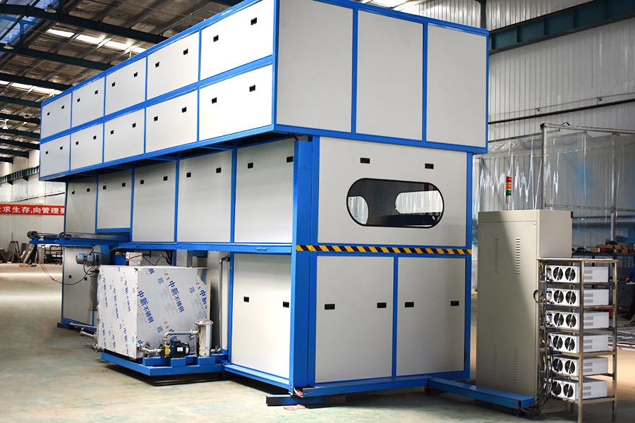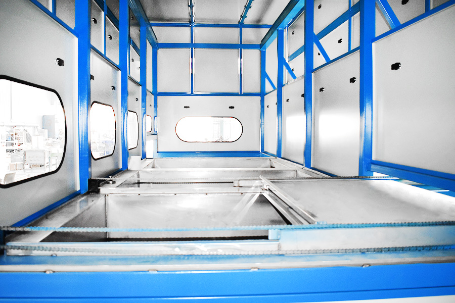 該設備有自動上下料及轉角系統(tǒng)、超聲波清洗系統(tǒng),自動拋動、自動溢流和油污分離裝置,噴淋系統(tǒng)、自動高壓切水系統(tǒng)、自動烘干系統(tǒng)。機械手自動輸送系統(tǒng)采用高精度直線導軌配合高精度位置檢測傳感器,機械手可以準確的實現(xiàn)工件的抓取和放置。自動進排液和自動加溫系統(tǒng)完全實現(xiàn)了無人干預,自動運行,很大程度上降低了工人的勞動強度。先進的霧氣處理系統(tǒng)可以將清洗時產(chǎn)生的霧氣冷凝回流,空氣經(jīng)過濾和活性炭吸附后排出。