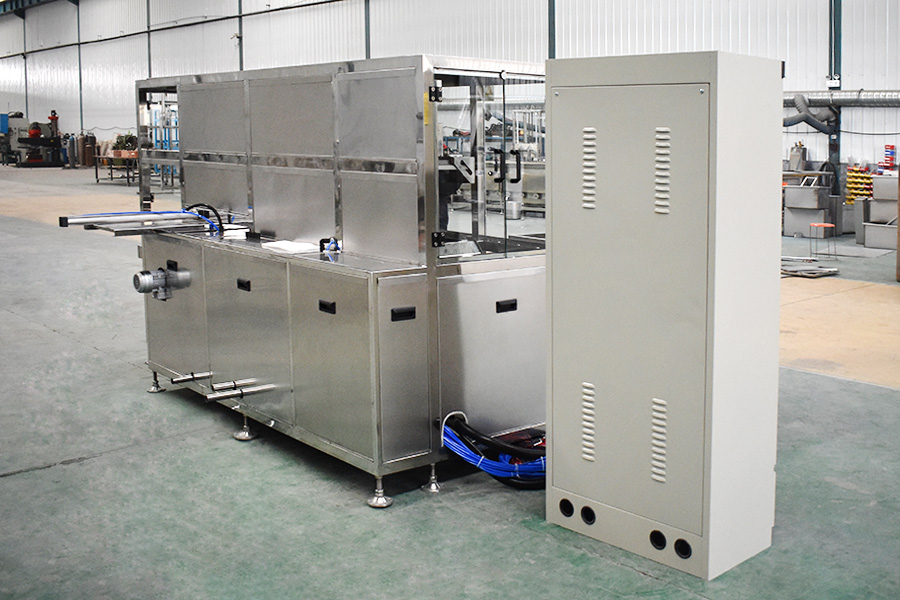 該設備有自動上下料及轉角系統、超聲波清洗系統,自動拋動、自動溢流和油污分離裝置,噴淋系統、自動高壓切水系統、自動烘干系統。機械手自動輸送系統采用高精度直線導軌配合高精度位置檢測傳感器,機械手可以準確的實現工件的抓取和放置。自動進排液和自動加溫系統完全實現了無人干預,自動運行,很大程度上降低了工人的勞動強度。先進的霧氣處理系統可以將清洗時產生的霧氣冷凝回流,空氣經過濾和活性炭吸附后排出。